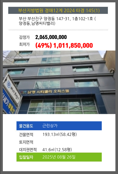본건은 부산 부산진구 양정동 147-31, 1층102-1호 (양정동,남명씨티밸리)