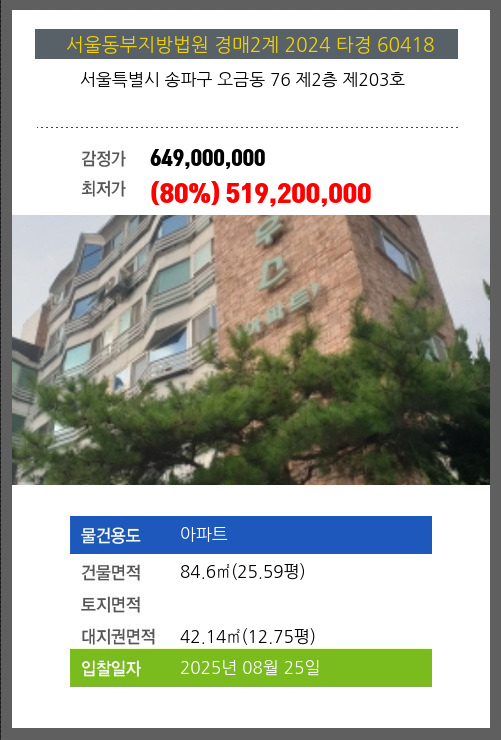 | 매각대상 | 공시가격3~4억 | 경매종류 | 임의경매 | 사건접수일 | 2024-08-26 |