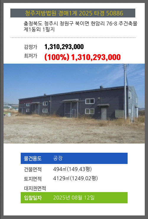 청주공장경매 청주시 청원구 북이면 현암리 76-8 주건축물제1동외 1필지 №2025 타경 50886