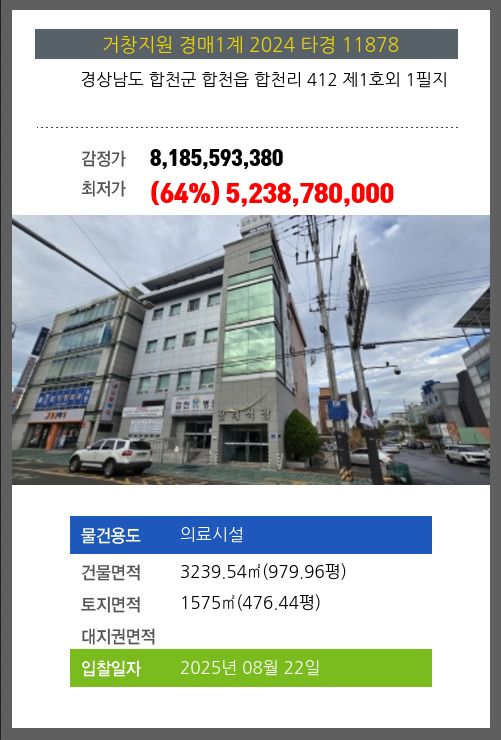 | 용도 | 의료시설 | 채권자 | 화** | 감정가 | 8,185,593,380 |