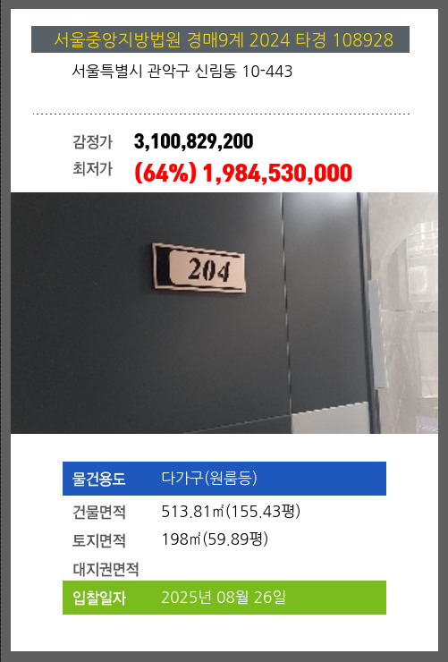 | 용도 | 다가구(원룸등) | 채권자 | 관** | 감정가 | 3,100,829,200 |