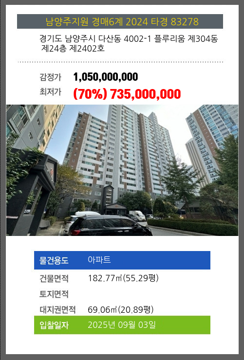 남양주아파트경매 남양주시 다산동 4002-1 플루리움 제304동 제24층 제2402호 №2024 타경 83278
