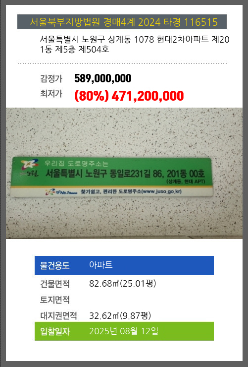 노원아파트경매 노원구 상계동 1078 현대2차아파트 제201동 제5층 제504호 №2024 타경 116515