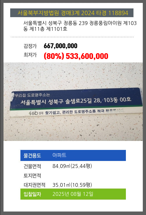 성북아파트경매 성북구 정릉동 239 정릉풍림아이원 제103동 제11층 제1101호 №2024 타경 118894