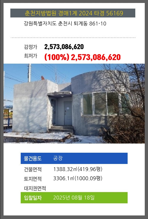 | 용도 | 공장 | 채권자 | 중** | 감정가 | 2,573,086,620 |