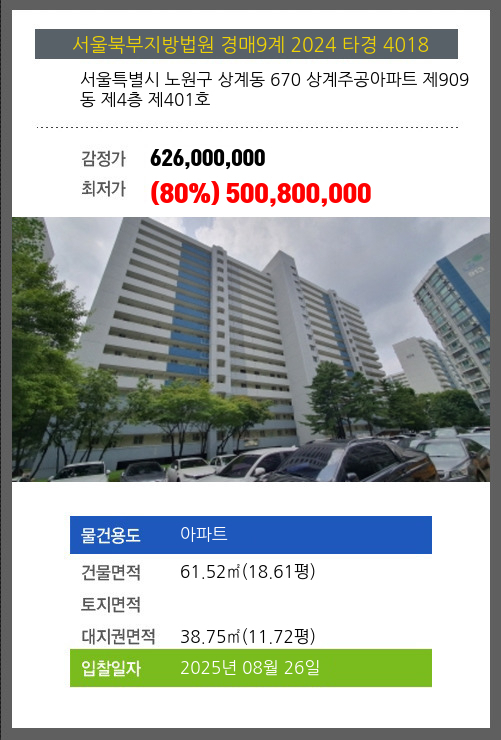 | 건물면적 | 61.52㎡ (18.61평) | 채무자 | 김** | 최저가 | (80%) 500,800,000 |