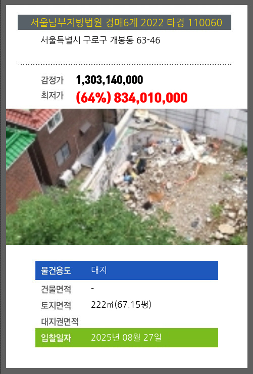 | 매각대상 | 재개발, 유치권 | 경매종류 | 강제경매 | 사건접수일 | 2022-06-22 |