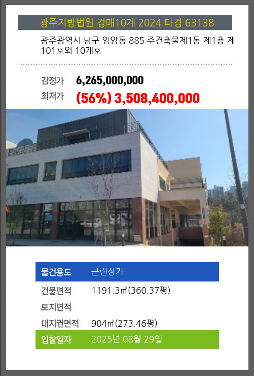 | 소재지 | [지번] 광주광역시 남구 임암동 885 주건축물제1동 제1층 제101호외 10개호 [도로명 주소] 광주광역시 남구 서문대로 375 주건축물제1동 제1층 제101호외 10개호 |
