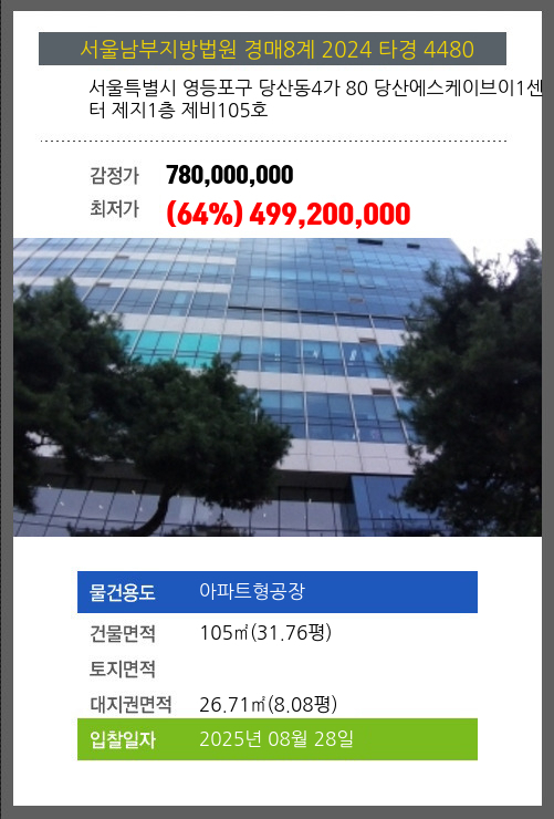 영등포아파트형공장경매 영등포구 당산동4가 80 당산에스케이브이1센터 제지1층 제비105호 №2024 타경 4480