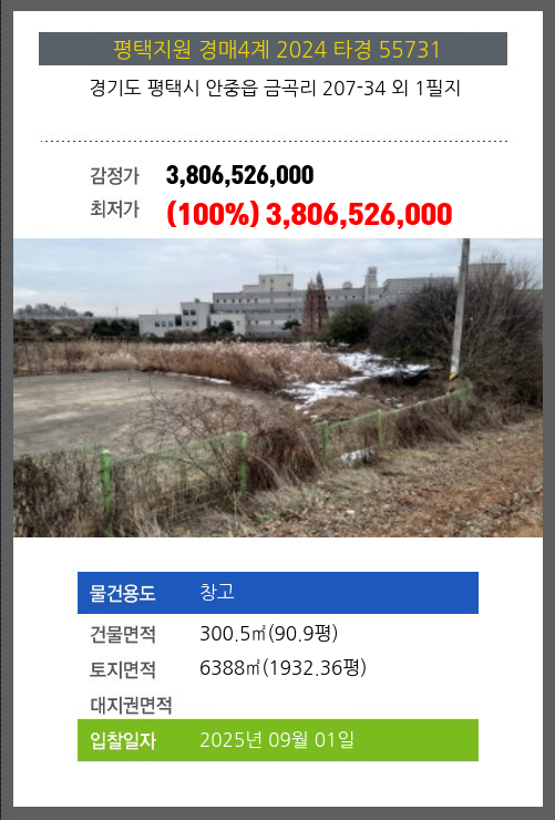 | 토지면적 | 6388㎡ (1932.36평) | 소유자 | 윤** | 보증금 | (10%) 380,652,600 |