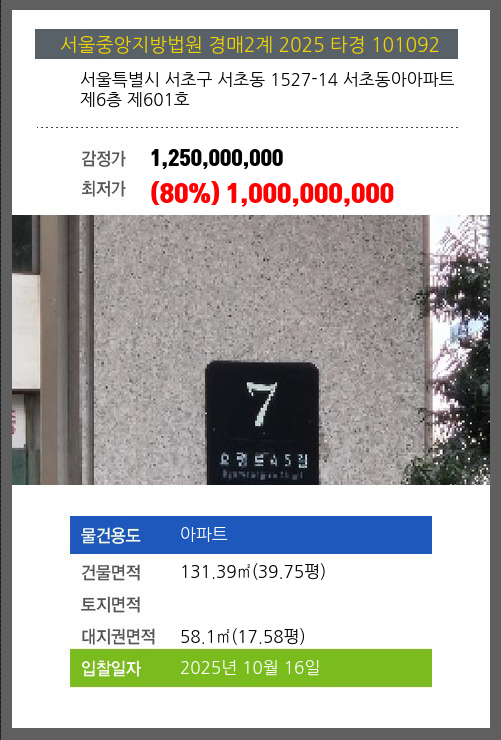 서초아파트경매 서초구 서초동 1527-14 서초동아아파트 제6층 제601호 №2025 타경 101092