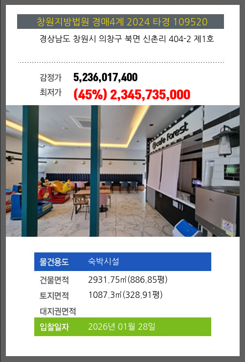 | 용도 | 숙박시설 | 채권자 | 대** | 감정가 | 5,236,017,400 |