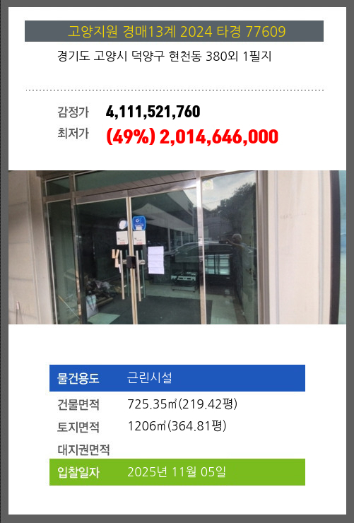 | 건물면적 | 725.35㎡ (219.42평) | 채무자 | 이**외1명 | 최저가 | (49%) 2,014,646,000 |
