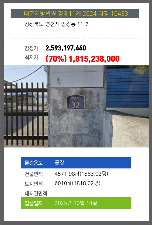 | 건물면적 | 4571.98㎡ (1383.02평) | 채무자 | 김** | 최저가 | (70%) 1,815,238,000 |