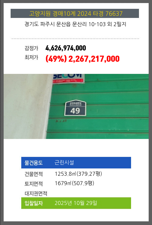 | 소재지 | [지번] 경기도 파주시 문산읍 문산리 10-103 외 2필지 [도로명 주소] 경기도 파주시 문산읍 문향로39번길 34 외 2필지 |