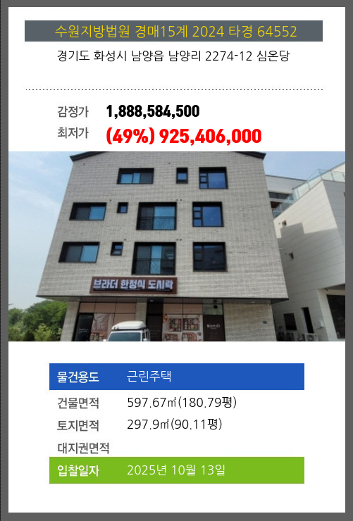 | 용도 | 근린주택 | 채권자 | 화** | 감정가 | 1,888,584,500 |