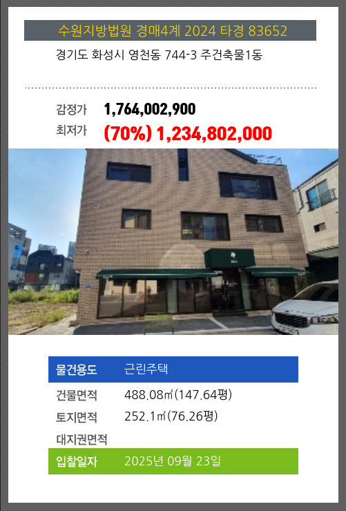 | 용도 | 근린주택 | 채권자 | ㈜** | 감정가 | 1,764,002,900 |