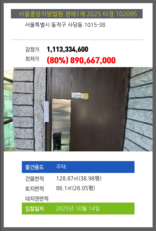 | 건물면적 | 128.87㎡ (38.98평) | 채무자 | 권** | 최저가 | (80%) 890,667,000 |