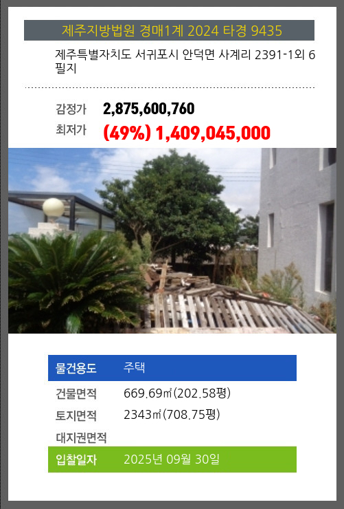 | 건물면적 | 669.69㎡ (202.58평) | 채무자 | 농** | 최저가 | (49%) 1,409,045,000 |