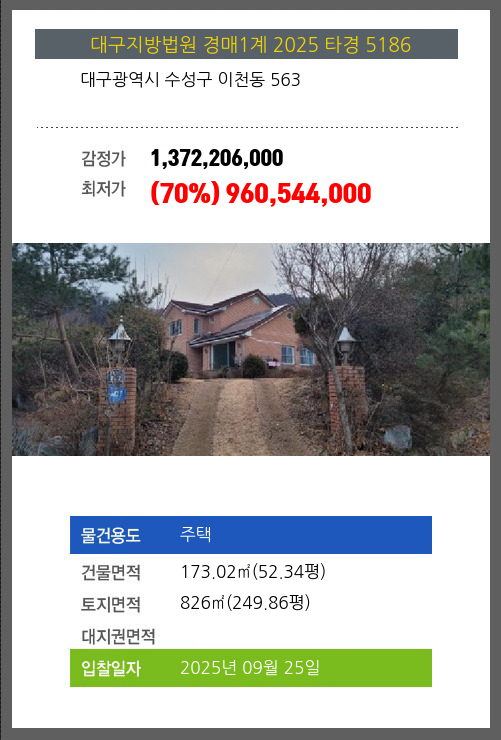 | 건물면적 | 173.02㎡ (52.34평) | 채무자 | 남** | 최저가 | (70%) 960,544,000 |