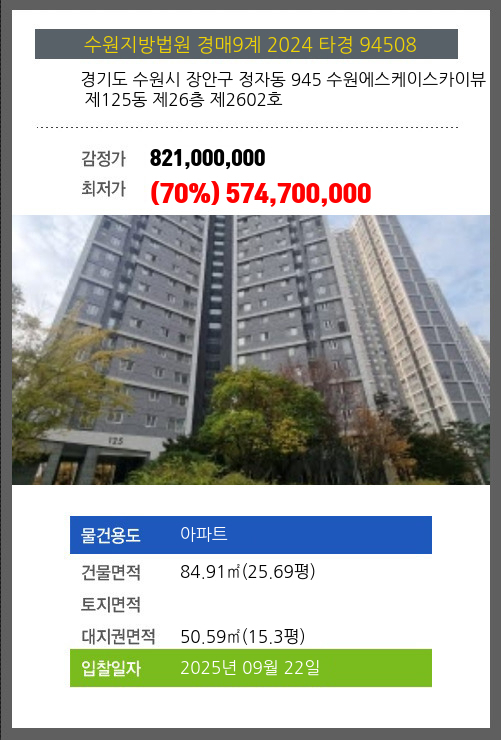 본건은 경기도 수원시 장안구 정자동 945 수원에스케이스카이뷰 제125동 제26층 제2602호
