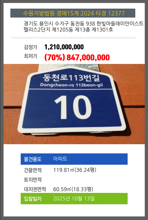 본건은 경기도 용인시 수지구 동천동 938 한빛마을래미안이스트팰리스2단지 제1205동 제13층 제1301호