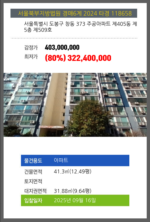 도봉아파트경매 도봉구 창동 373 주공아파트 제405동 제5층 제509호 №2024 타경 118658