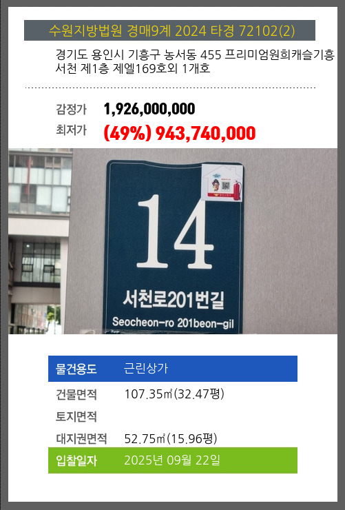 본건은 경기도 용인시 기흥구 농서동 455 프리미엄원희캐슬기흥서천 제1층 제엘169호외 1개호