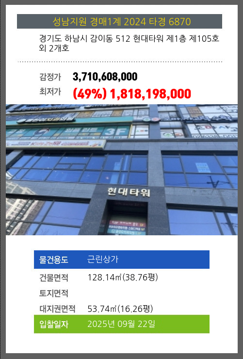 | 용도 | 근린상가 | 채권자 | 전** | 감정가 | 3,710,608,000 |