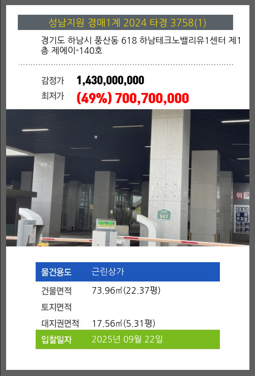 하남상가경매 하남시 풍산동 618 하남테크노밸리유1센터 제1층 제에이-140호 №2024 타경 3758(1)