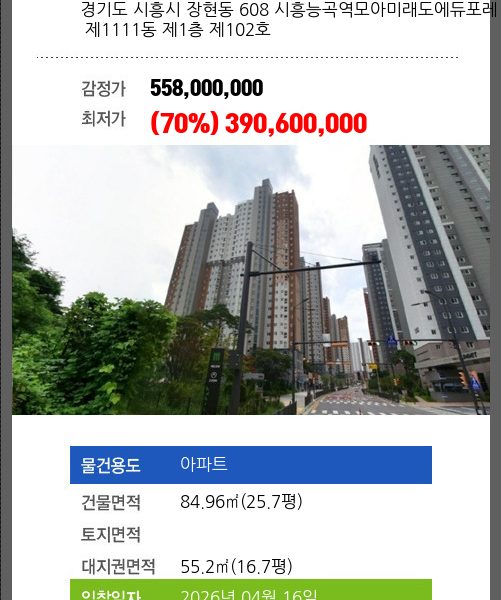 | 대지권 | 56.95㎡ (17.23평) | 소유자 | ㈜** | 보증금 | (10%) 54,600,000 |