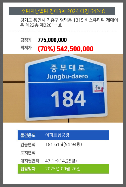 | 용도 | 아파트형공장 | 채권자 | 중** | 감정가 | 775,000,000 |