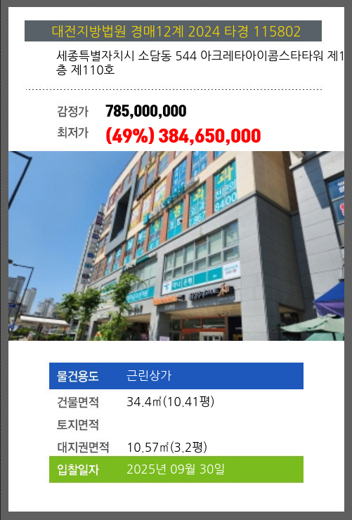 본건은 세종특별자치시 소담동 544 아크레타아이콤스타타워 제1층 제110호