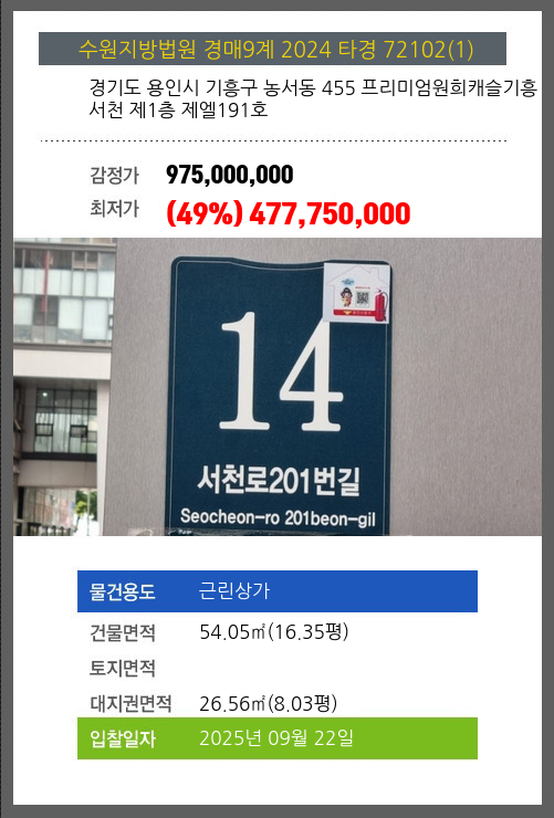 본건은 경기도 용인시 기흥구 농서동 455 프리미엄원희캐슬기흥서천 제1층 제엘191호