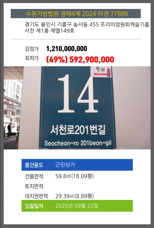 용인상가경매 용인시 기흥구 농서동 455 프리미엄원희캐슬기흥서천 제1층 제엘149호 №2024 타경 77886