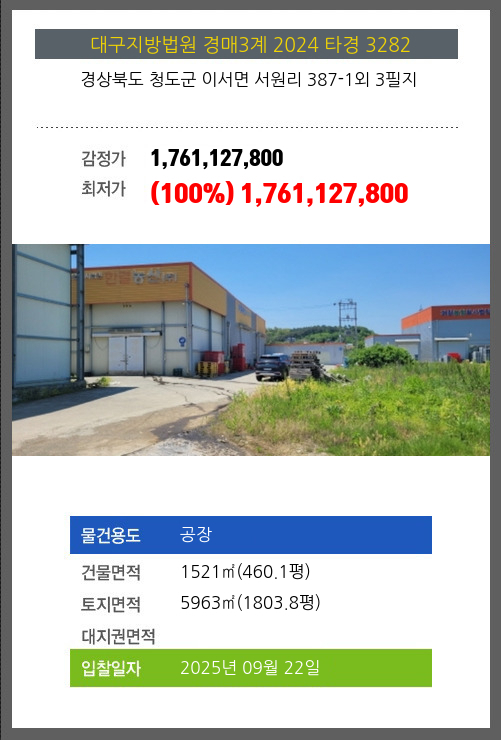 | 용도 | 공장 | 채권자 | 청**외1명 | 감정가 | 1,761,127,800 |