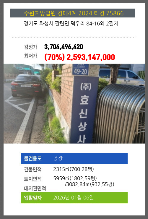 화성공장경매 화성시 팔탄면 덕우리 84-16외 2필지 №2024 타경 75866