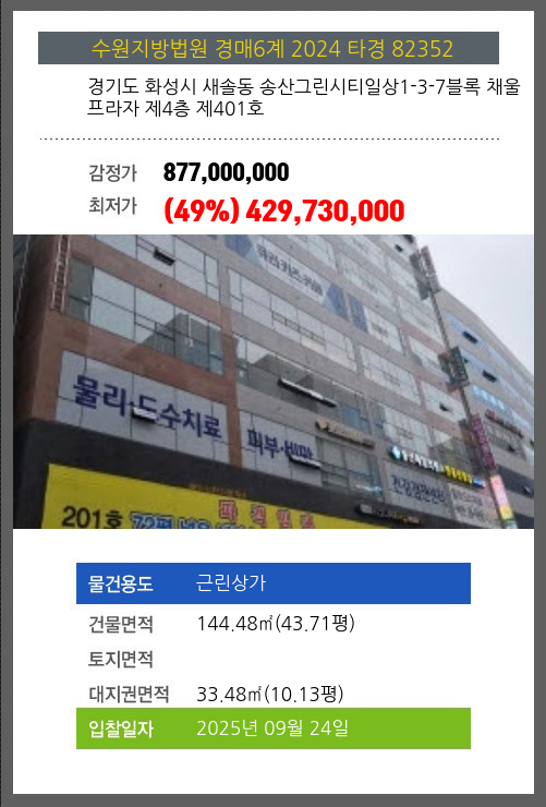 화성상가경매 화성시 새솔동 송산그린시티일상1-3-7블록 채울프라자 제4층 제401호 №2024 타경 82352