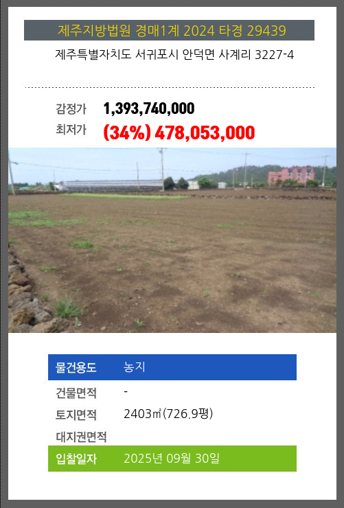 | 용도 | 농지 | 채권자 | 봉** | 감정가 | 1,393,740,000 |