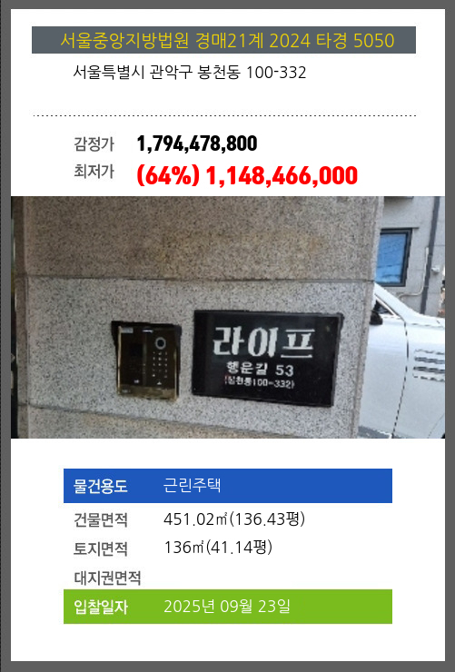 건물면적 451.02㎡ (136.43평) 채무자 윤**외1명 최저가 (64%) 1,148,466,000