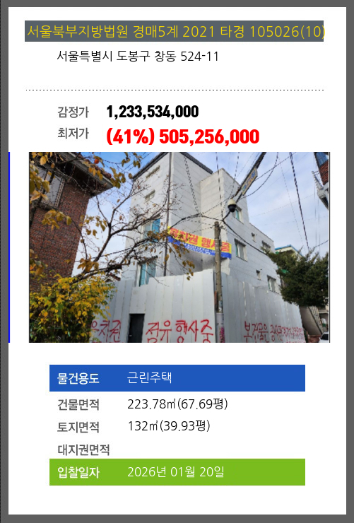 | 최초경매일 | 2026-01-20 | 배당종기일 | (-일) | 경매개시일 | 2021-06-18 |