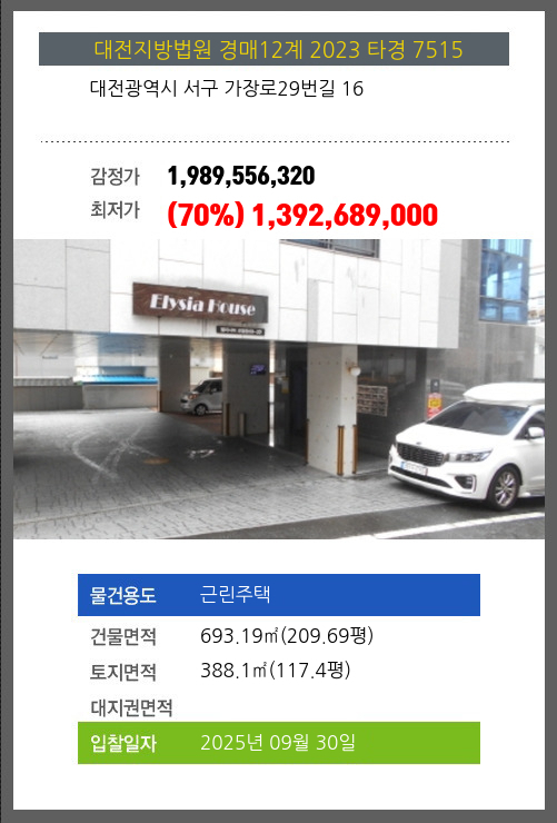 | 용도 | 근린주택 | 채권자 | 대** | 감정가 | 1,989,556,320 |