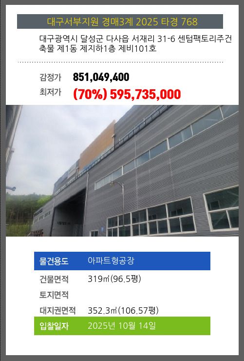 달성아파트형공장경매 달성군 다사읍 서재리 31-6 센텀팩토리주건축물 제1동 제지하1층 제비101호 №2025 타경 768