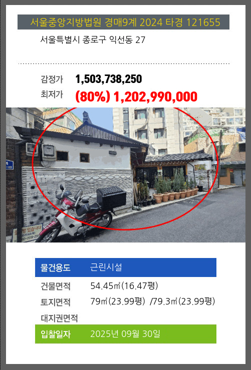 | 토지면적 | 전체:79㎡ (23.99평) 매각지분:79.3㎡ (23.99평) |