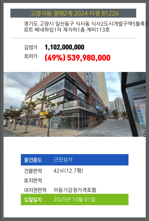 고양상가경매 고양시 일산동구 식사동 식사2도시개발구역5블록3로트 베네하임1차 제지하1층 제비113호 №2024 타경 81226
