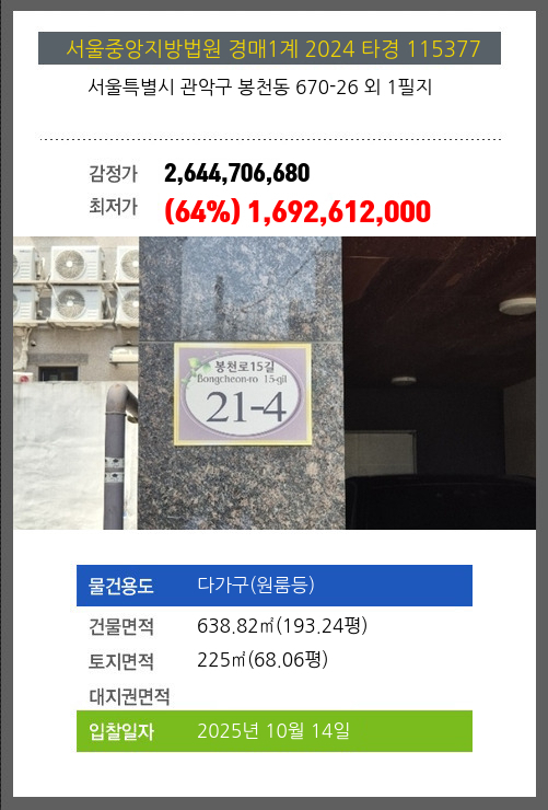 관악다가구(원룸등)경매 관악구 봉천동 670-26 외 1필지 №2024 타경 115377