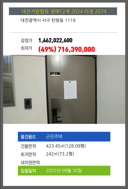 | 건물면적 | 423.45㎡ (128.09평) | 채무자 | 조** | 최저가 | (49%) 716,390,000 |