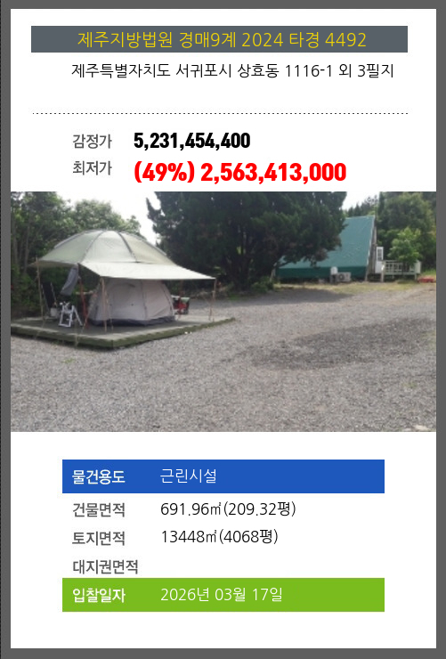 | 소재지 | [지번] 제주특별자치도 서귀포시 상효동 1116-1 외 3필지 [도로명 주소] 제주특별자치도 서귀포시 516로 574-23 외 3필지 |
