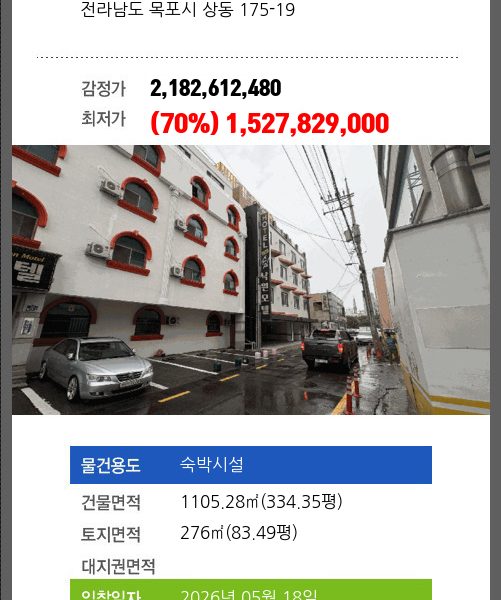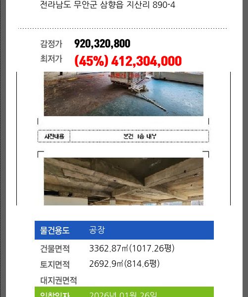 | 건물면적 | 3597.04㎡ (1088.1평) | 채무자 | 에**외1명 | 최저가 | (45%) 2,126,830,000 |