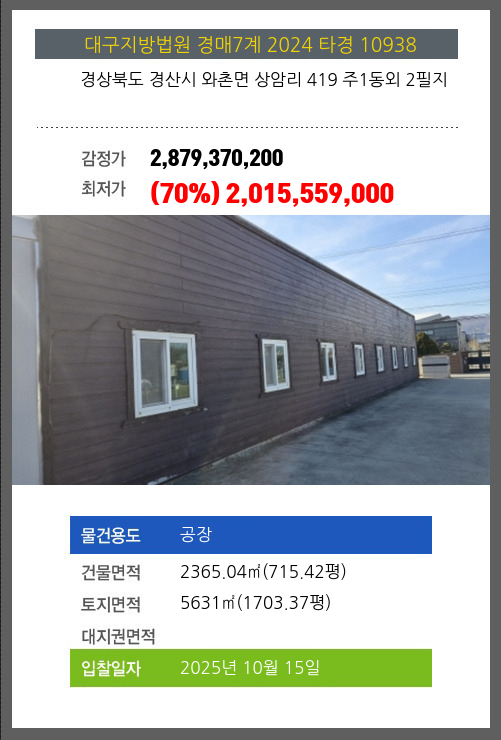 | 용도 | 공장 | 채권자 | ㈜** | 감정가 | 2,879,370,200 |